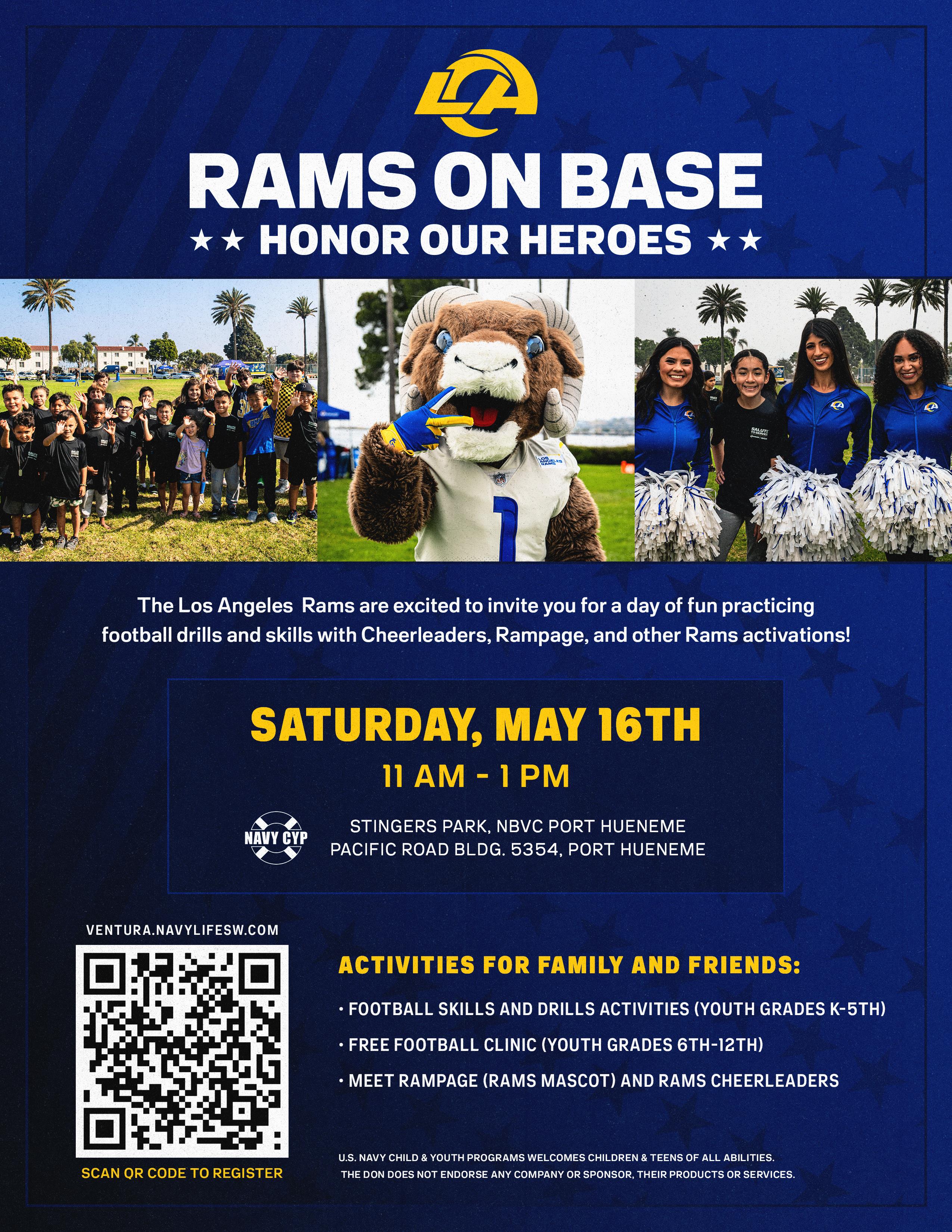 Join the LA Rams for a free youth football clinic at Naval Base Ventura County (NBVC) Port Hueneme. “Rams on Base” brings fun, fitness, and football to military families across Southern California.