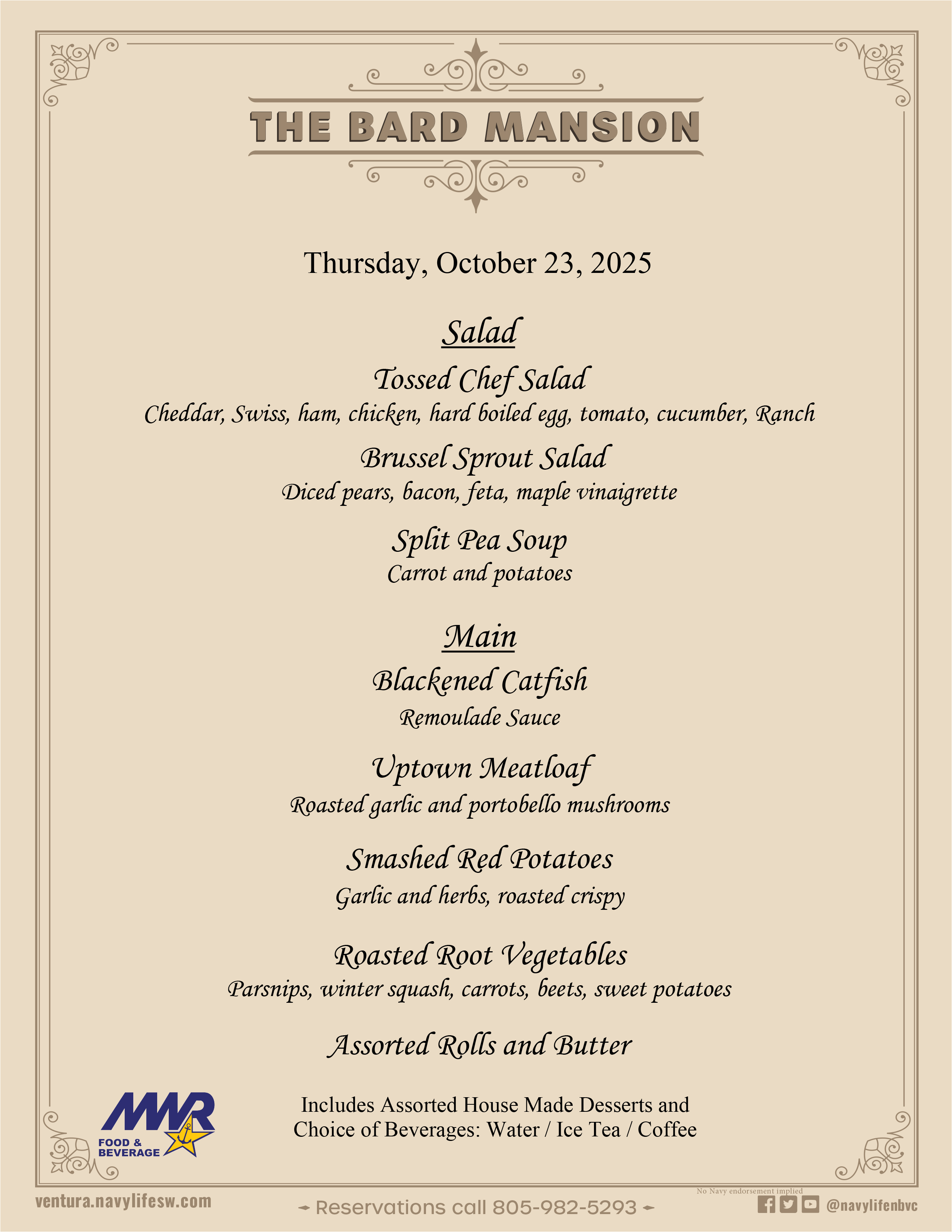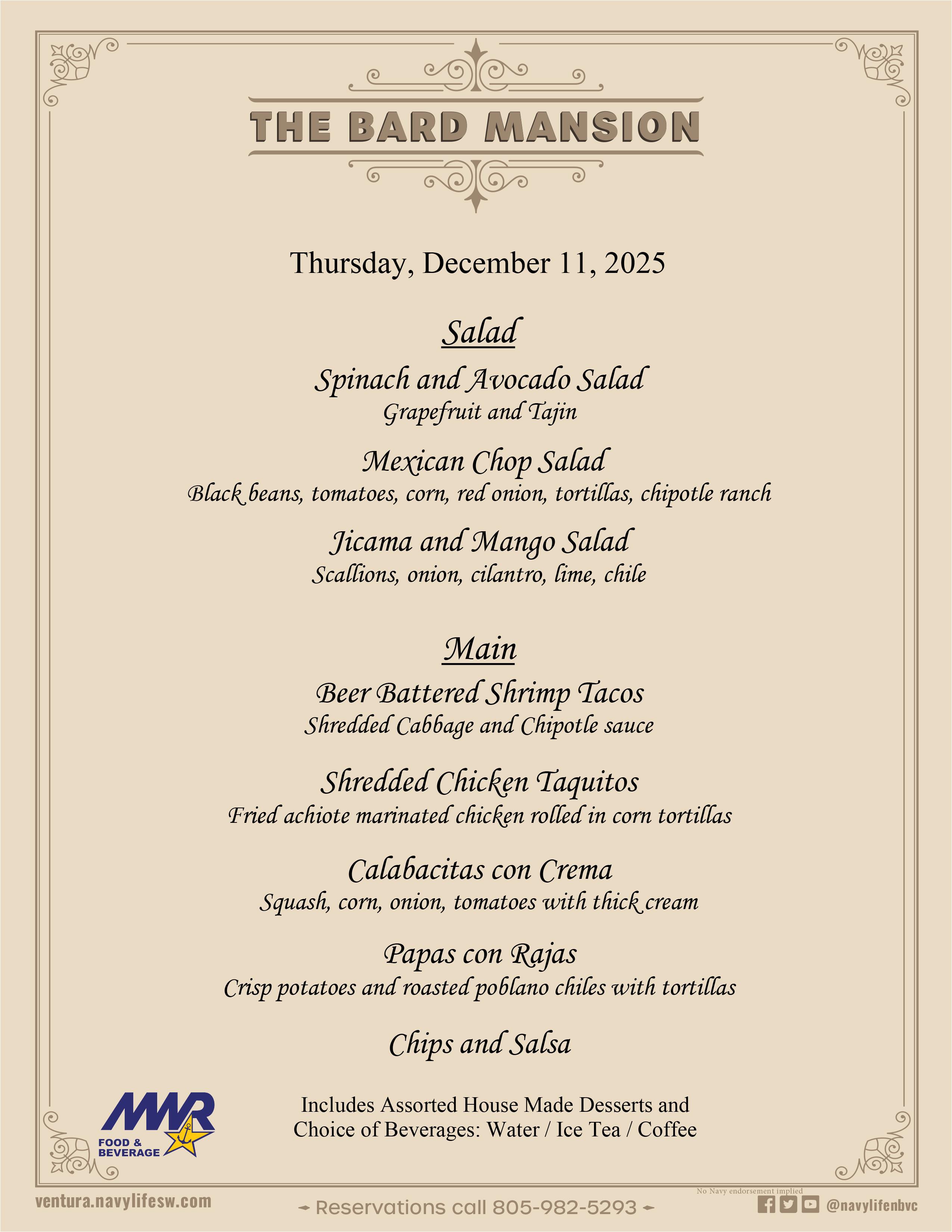 All ages are welcome at the bard Mansion. Please ask about our child’s pricing for our Thursday lunches with the hostess station. All patrons pay at the door, please remember that MWR is cashless. We accept all major cards, including your Military Star Card.