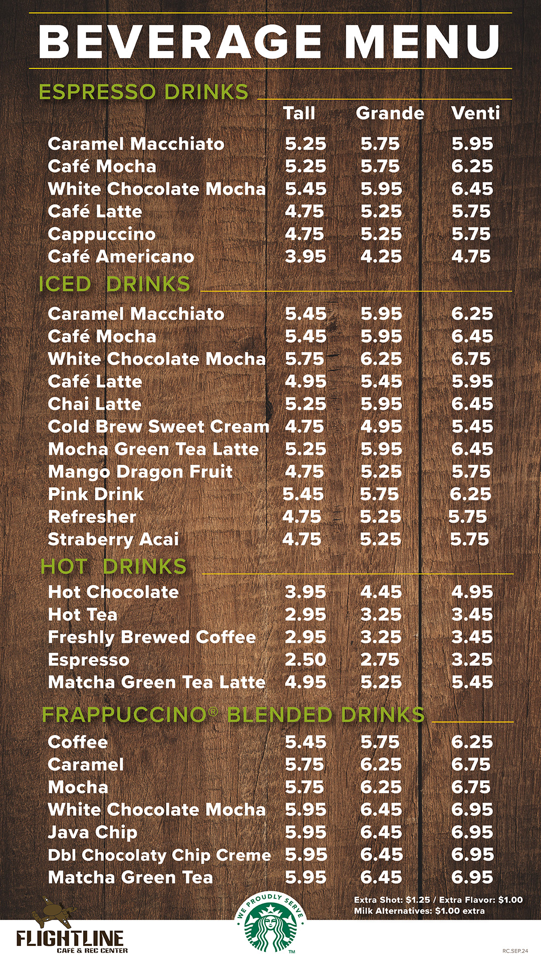 Looking for that morning or afternoon pick me up? We proudly serve Starbucks coffee with all your favorites including mochas, lattes, cappuccinos, macchiatos and frappuccinos and more.